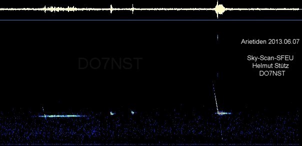 Mutterkörper: Asteroid 1566 Icarus Eigenschaften: Tagaktive Meteore. Niedergangsrate ( ZHR ) > 60 /h . V= 39 km/s . Aufnahmedatum: 07.06.13 , 04:00 - 14:30 MEZ Aufzeichnungsort: Heroldsberg Benutzter Sender: Graves, France. Range: 950 km, Freq.: 143.050 MHz Empfänger: ICOM R20 Scanner (Mode USB) , YAESU FT897D (Mode CW) Antenne: Rundstrahler, vertikal polarisiert. |