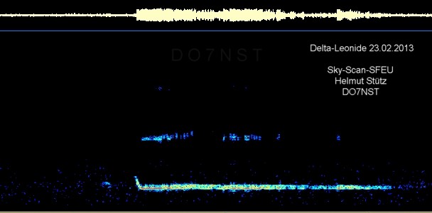 Möglicher Mutterkörper: Asteroid (4450) Pan Eigenschaften: Tagaktive Meteore. Niedergangsrate ( ZHR ) ca. 2 - 5/h . V= 23 km/s . Aufnahmedatum: 23.02.13 , 06:00 MEZ Aufzeichnungsort: Heroldsberg Benutzter Sender: Graves, France. Range: 950 km, Freq.: 143.050 MHz Empfänger: ICOM R20 Scanner, Mode CW Antenne: Rundstrahler, vertikal polarisiert. |