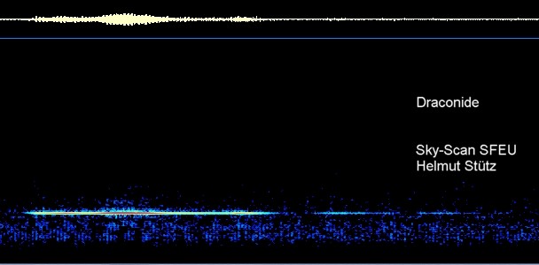 Mutterkomet: 21P/Giacobini-Zinner Eigenschaften: Die Niedergangsrate ( ZHR ) ist periodisch zwischen 150 und über 500/h. V= 20km/s . Langer heller overdense Meteor. Aufnahmedatum: 10.10.2004 15 Uhr MEZ Aufzeichnungsort: Oedhof/Eckental Benutzter Sender: Geibstad/Norwegen, Range: 989 km, Freq.: 48.252.000 MHz Empfänger: ICOM R20 Scanner, Mode USB Antenne: 6-Element Yagi TV-Band I, Elevation 35 °, Polarisation horizontal |