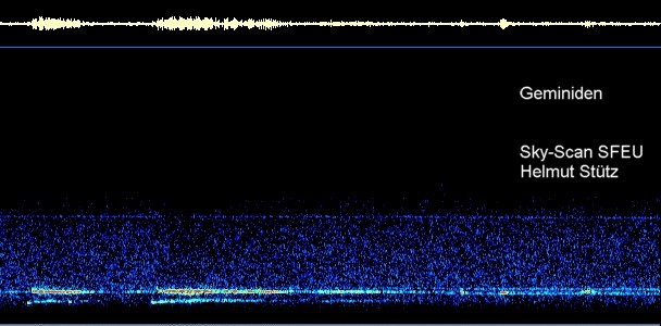 Mutterkomet: Als Ursprungskörper der Geminiden gilt ein als klassifizierter Asteroid namens Phaethon. Vermutungen zufolge könnte Phaethon ein "erloschener" Komet sein, der seine flüchtigen Bestandteile Gas und Staub bereits vollständig verloren hat. Eigenschaften: Niedergangsrate ( ZHR ) 120 - 140/h +/-, V= 35 km/s . Aufnahmedatum: 14.12.2004 um 00:40 Uhr MEZ Aufzeichnungsort: Oedhof/Eckental Benutzter Sender: Vorta/Rumänien, Range: ca: ca. 950 km, Freq.: 59.257.868 MHz Empfänger: ICOM R20 Scanner, Mode USB Antenne: 6-Element Yagi TV-Band I, Elevation 30 °, Polarisation horizontal |