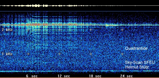 Mutterkomet: Als Mutterkörper wird der am 06.März entdeckte Asteroid 2003 EH1 vermutet. Sonnenumlaufbahn des Asteroiden als auch Bahn der Quadrantiden stimmen recht gut überein. Ebenso die Bahnelemente von Komet C/1490 Y1 decken sich sehr gut mit den Quadrantiden. Eigenschaften: Niedergangsrate ZHR variabel 120 - 200/h. V= 41 km/s. Die Quadrantiden zählen eher zu den langsameren Meteoren. Die Aufnahme zeigt einen typischen oszillierenden Meteor. Aufnahmedatum: 03.01.2005 um 12:59 Uhr MEZ Aufzeichnungsort: Oedhof/Eckental Benutzter Sender: Bispfors/Schweden, Range: 1542 km, Freq. 48.255.200 MHz Empfänger: ICOM R20 Scanner, Mode USB Antenne: 6-Element Yagi TV-Band I, Elevation 40 °, Polarisation horizontal |