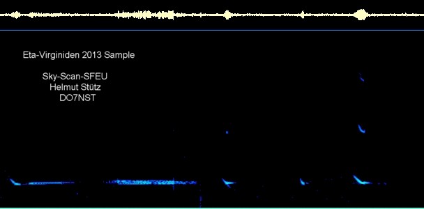 Ursprungskomet: Unbekannt Eigenschaften: Tagaktive Meteore. Niedergangsrate ( ZHR ) 3 - 5/h . V= 30 km/s . Aufnahmedatum: 19.03.13 , 09:30 - 14:30 MEZ Aufzeichnungsort: Heroldsberg Benutzter Sender: Graves, France. Range: 950 km, Freq.: 143.050 MHz Empfänger: ICOM R20 Scanner (Mode USB) , YAESU FT897D (Mode CW) Antenne: Rundstrahler, vertikal polarisiert. |